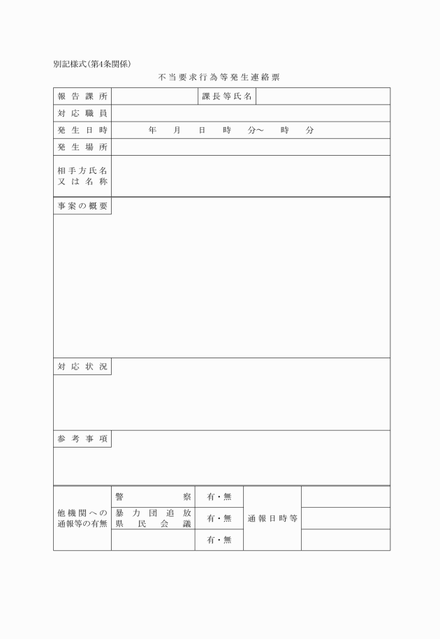 第4条 課長等は、その職場において不当要求行為等が発生し、又はそのおそれがあると認めたときは、直ちに警告、退去命令、排除、警察への通報等の必要な措置を講じ、その都度、不当要求行為等発生連絡票(別記様式)により管理者に報告しなければならない。