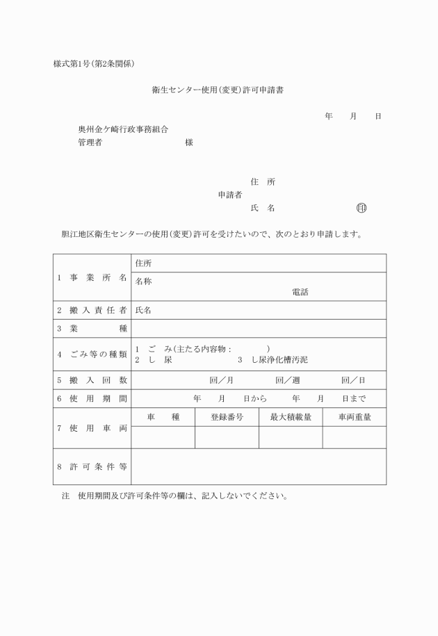 第3条 管理者は、胆江地区衛生センター(以下「衛生センター」という。)の使用を許可したときは、衛生センター使用(変更)許可証(様式第2号。以下「許可証」という。)を交付するものとする。