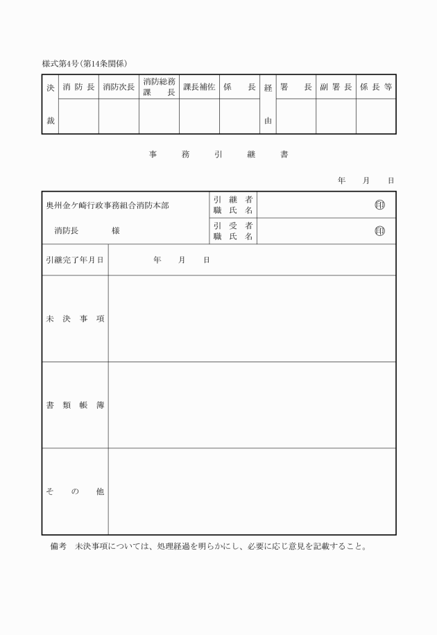 第14条 職員は、退職、出向、配置換又は休職等のため、担任事務を離れる場合においては、事務引継書(様式第4号)により、その事務を速やかに後任者又は消防長が指定する者に引継がなければならない。ただし、消防長の承認を得た場合は、口頭で引継ぐことができる。