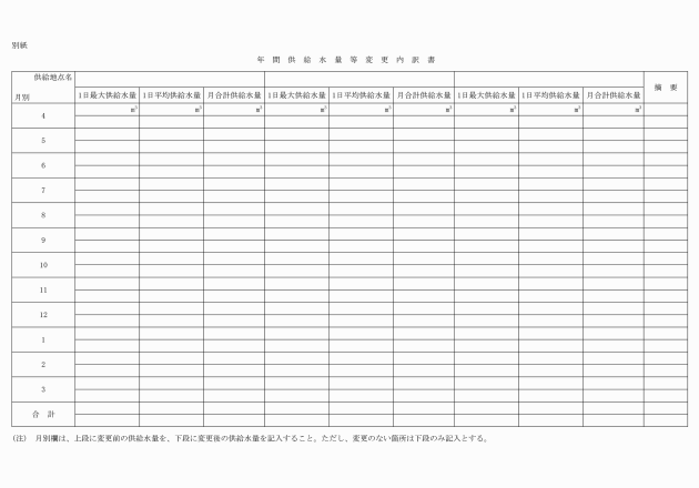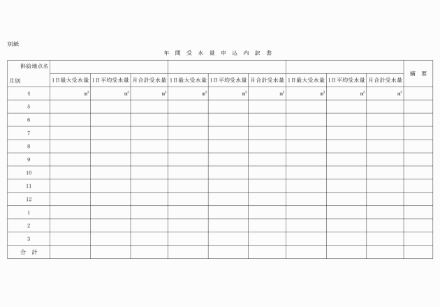 第4条 受水団体は、毎年翌年度の年間受水量を、毎年11月30日までに年間受水量等申込書(様式第1号)により水道管理者に申し込まなければならない。