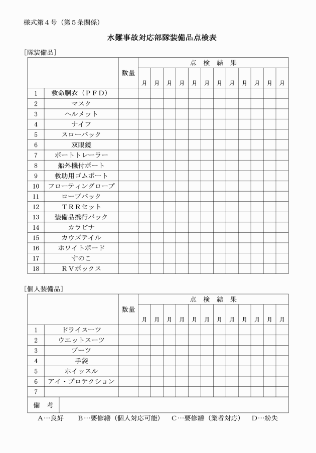 第9条 水難事故対応部隊の隊員は、水域における活動を行ううえで必要な知識の習得、技術の向上及び体力の錬成を図るとともに、水難救助用器具を保全するよう努めなければならない。